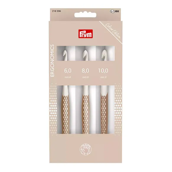 Prym Ergonomiškų vąšelių rinkinyje rasite 3 skirtingų dydžių plastikinius ergonomiškus vąšelius su neslystančia rankenėle. Su šiais vąšeliais galite mėgautis nėrimu ilgas valandas – rankos nejaučia jokio nuovargio.